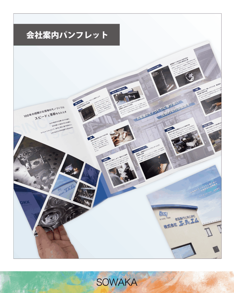 金型制作の工程と設備の紹介をメインとした会社案内パンフレットです。コーポレートカラーのブルーを基調とし、シンプルでさわやかなデザインとなりました。撮影から協力させていただいております。