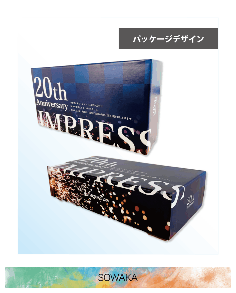 20周年記念のお菓子の箱をデザインさせていただきました。加工中の火花の写真を使用し、周年記念の華やかさを演出しました。