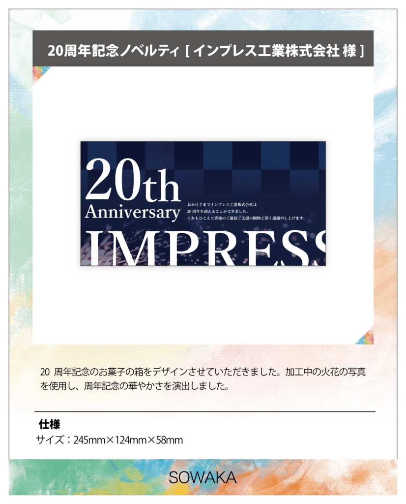 20周年記念のお菓子の箱をデザインさせていただきました。加工中の火花の写真を使用し、周年記念の華やかさを演出しました。